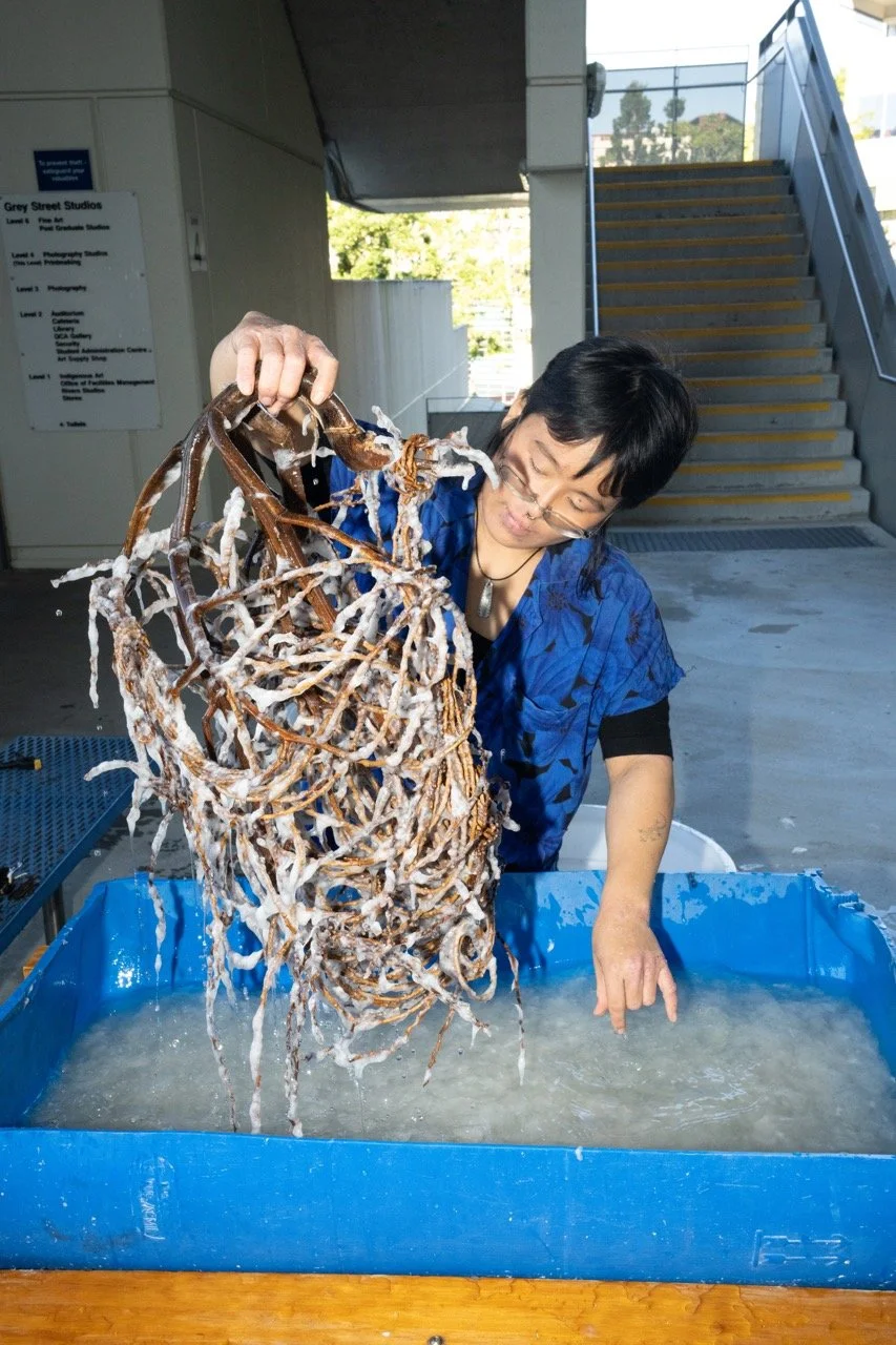 Kanako Enokida (she/her) is a multidisciplinary artist born in Japan and currently based in Meanjin. Working across installation, papermaking, and performance, her practice brings together fibre and the body to create fragile yet intimate encounters for viewers. Her work is driven by an ongoing exploration of inter-cultural identity and the body as a site of liminality - a vessel of collective memory.