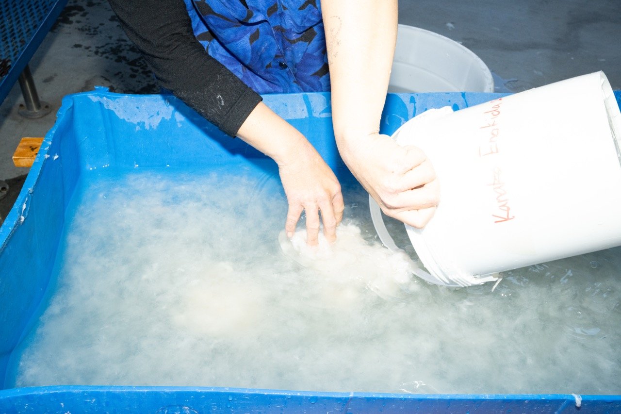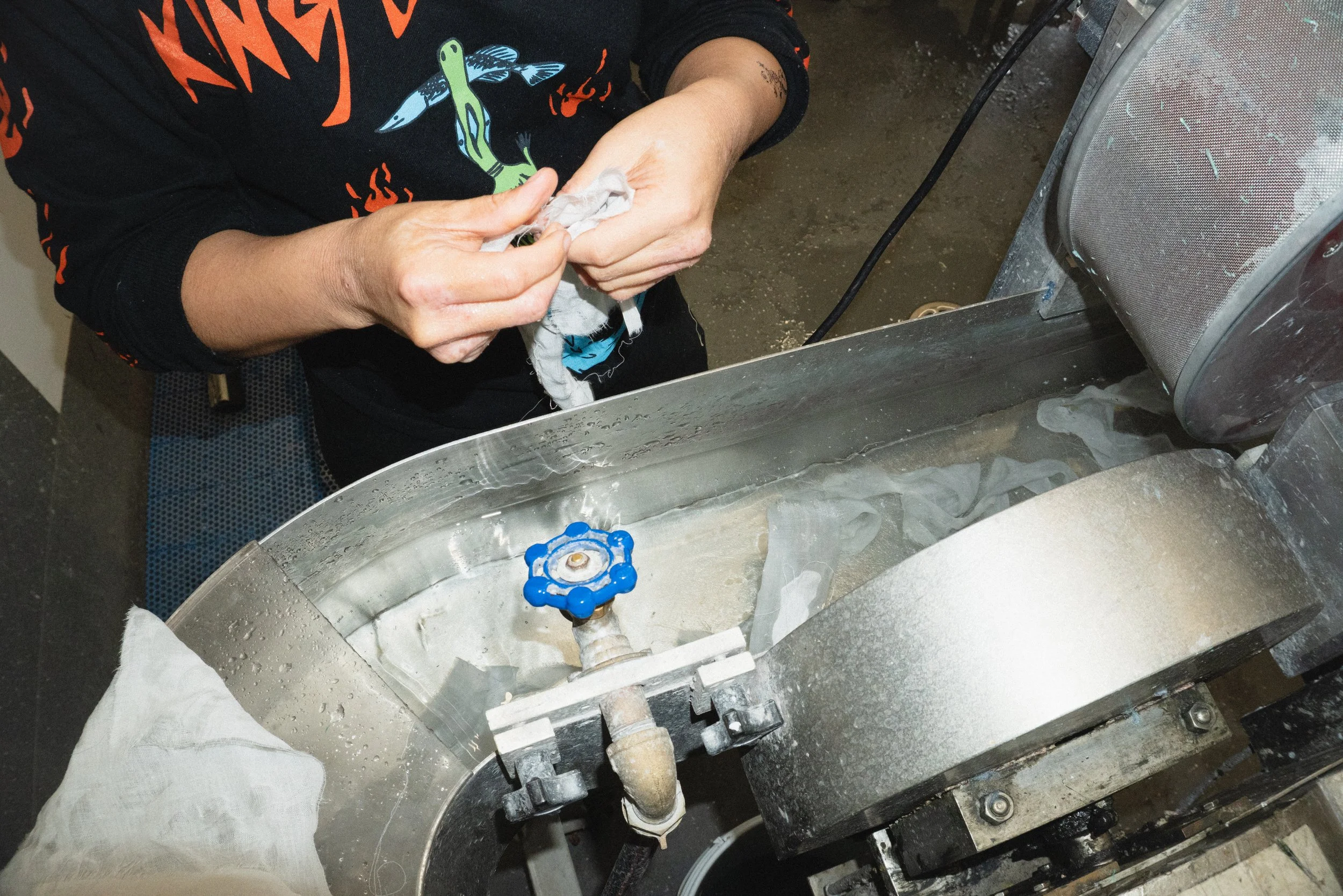 Process is the corner stone of my practice as the material transformation of papermaking. I wash old clothes with water, tear into small pieces, and using a Hollander, i beat them into fine fibrous paper making pulp. The pulp becomes versatile medium for my practice with which I sculpt, typograph, and form sheets.