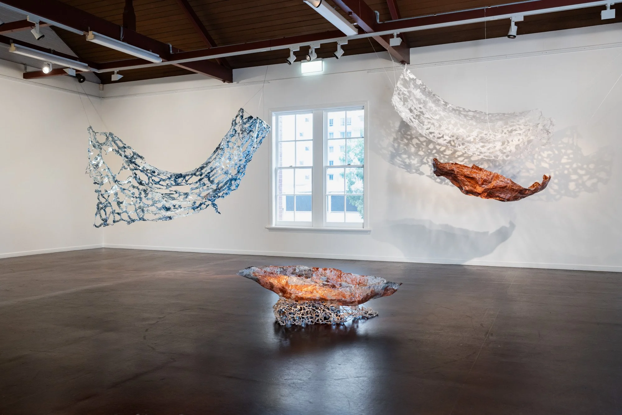 The fibrous landscape of currents, flows and boats reimagines my 旅路 (tabi-ji) — a journey of identity, relationships, and place that continues to shift through living across countries. Each element is made from garments that carried memories of home, such as a grey dress once worn by my grandmother, which I brought with me to Australia. I wore it as pyjamas during eczema flare-ups; its softness resting gently against inflamed skin. The tactile memory lives deeply within my body — the touch of the fabric returning me to a visceral sense of home. In making this work, I deconstructed these garments, beating and tearing them into fibrous pulp, which I reshaped into waterways and boats. The fibrous bodies of the boats symbolise quiet resilience within constant currents. Through materially broken down and reformed, memory continues to echo and move forward. In dialogue with Tamas-Cao’s stylistic language, the work activates a material conversation between our practices. Together, 旅路 reflects migratory identity — constantly breaking and becoming — like paper boats drifting through a sea of pulp, where cultures, memories, and ways of living dissolve and reform.